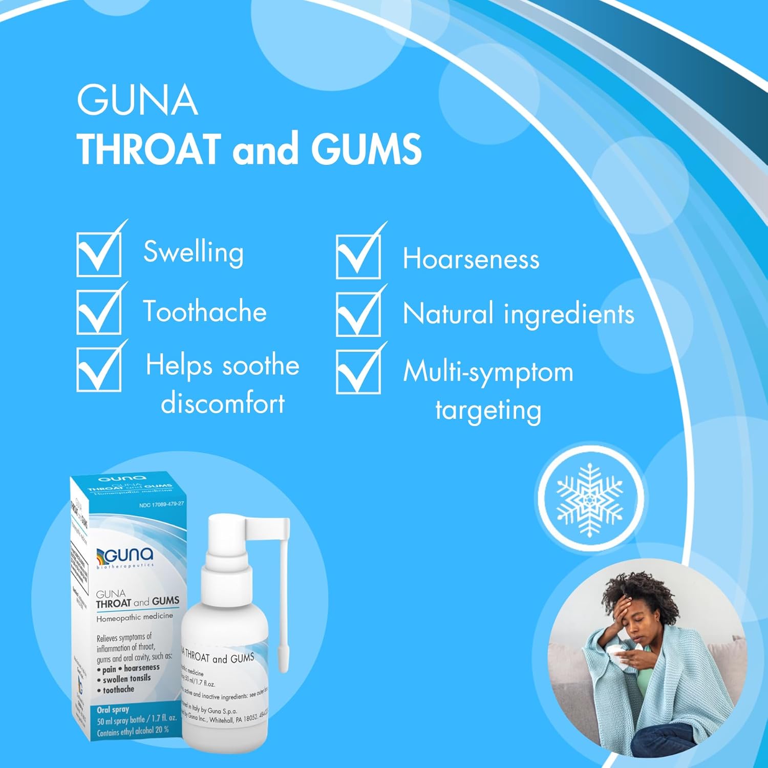 Relieves symptoms of inflammation of throat, gums, and oral cavity, such as pain, hoarseness, swollen tonsils, toothache.